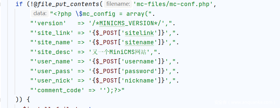 发现在安装文件的此处,没有对输入的信息进行任何的过滤,这导致我们可以直接通过输入的内容来往该文件中写入shell,例如我们可以构造payload,使得数据内容闭合,并且把后续的内容都注释掉。
