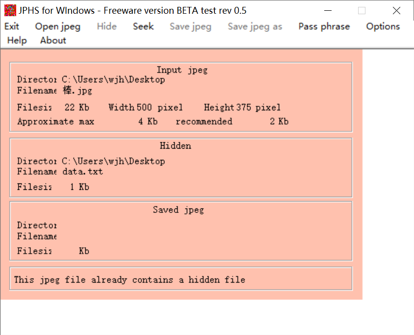 猜测是对文件的隐写,且因为其实jpg文件,尝试用JPHS来得到隐藏内容
