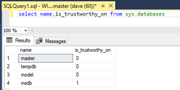 SQL version is lower than 2017, checking whether trustworthy is enabled on the connected DB: