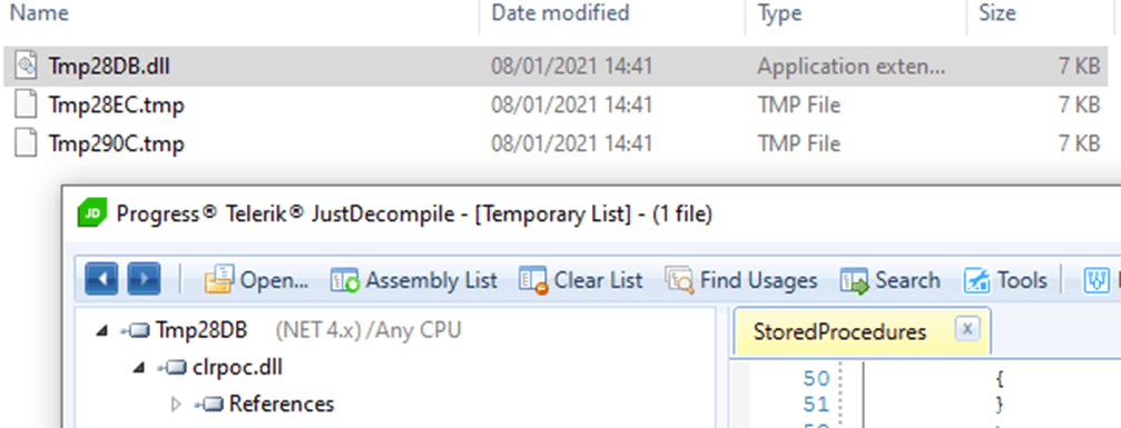 我们还可以通过调整文件权限以防止从C:\Windows\Temp\目录中删除文件,并在sqlservr.exe进程删除该文件之前检索该文件的副本。接下来,我们就可以通过反编译来显示出原始代码了: