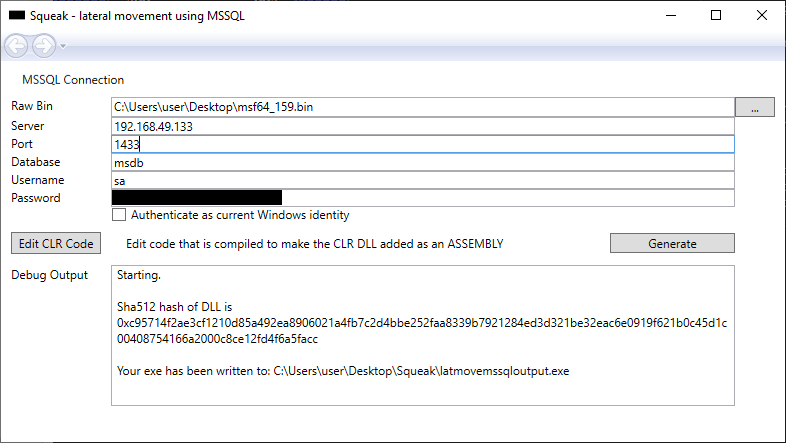 5、生成一个带有硬编码参数的.NET可执行文件,以通过SQL连接执行DLL–其中的可执行文件将执行以下操作: