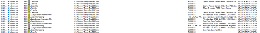 通过SQL命令调用程序集的过程也会导致几个名称不同的相同文件被写入SQL服务帐户的临时目录。下面的Procmon屏幕截图显示了正在创建的文件和正在向其中写入的.NET代码: