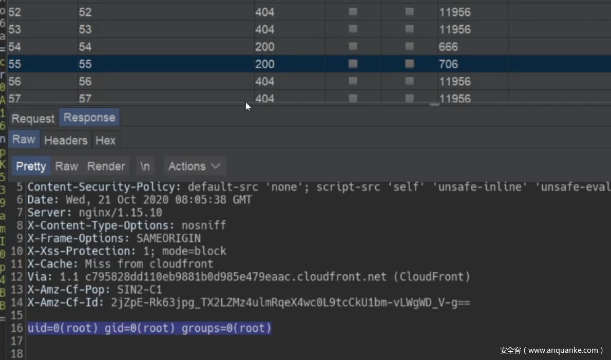 由于有负载平衡,所以我们此处需要使用burp的Intruder功能来发现我们的shell命令执行结果。