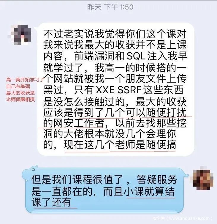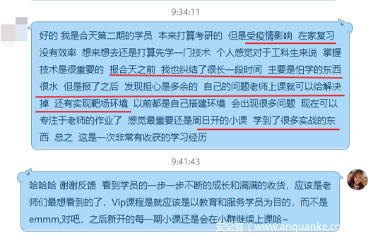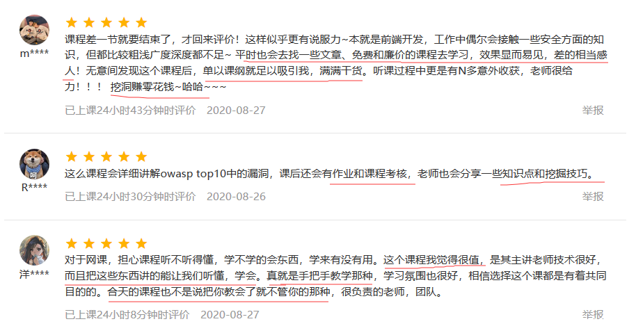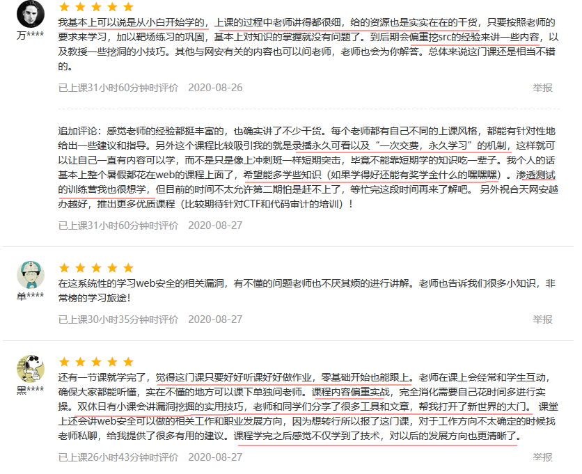 针对以上问题,为了帮助0~2年的Web安全新人少走弯路,我们产出了《Web安全工程师特训班》的课程,在之前结束的课程中,也得到了学员们100%的好评,以下为部分学员反馈。