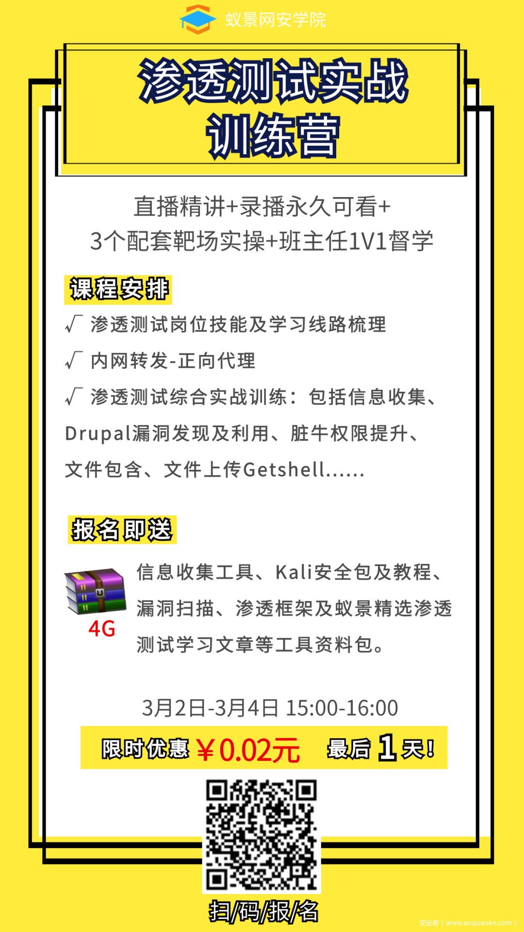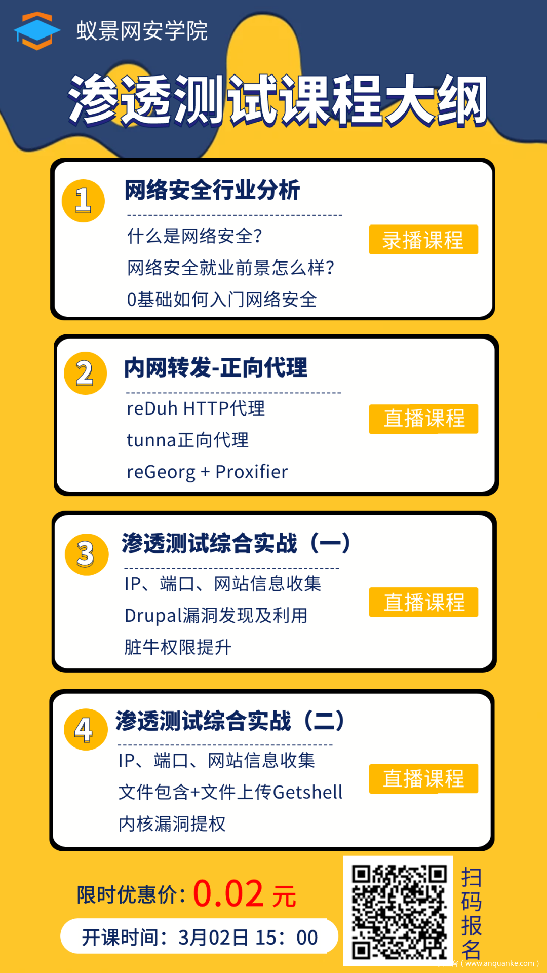 基于此,我们调研了数百家安全企业对于渗透测试人员的招聘需求,从岗位实际需求出发打造了这样一门课,7 节课 + 3 个实战练习 + 7天社群服务 + 实战作业反馈 ,原价198元,限时优惠只需要 2分钱 !课程第一节课将于 3月02日(15:00)开课,最后1天,赶紧抢购吧!