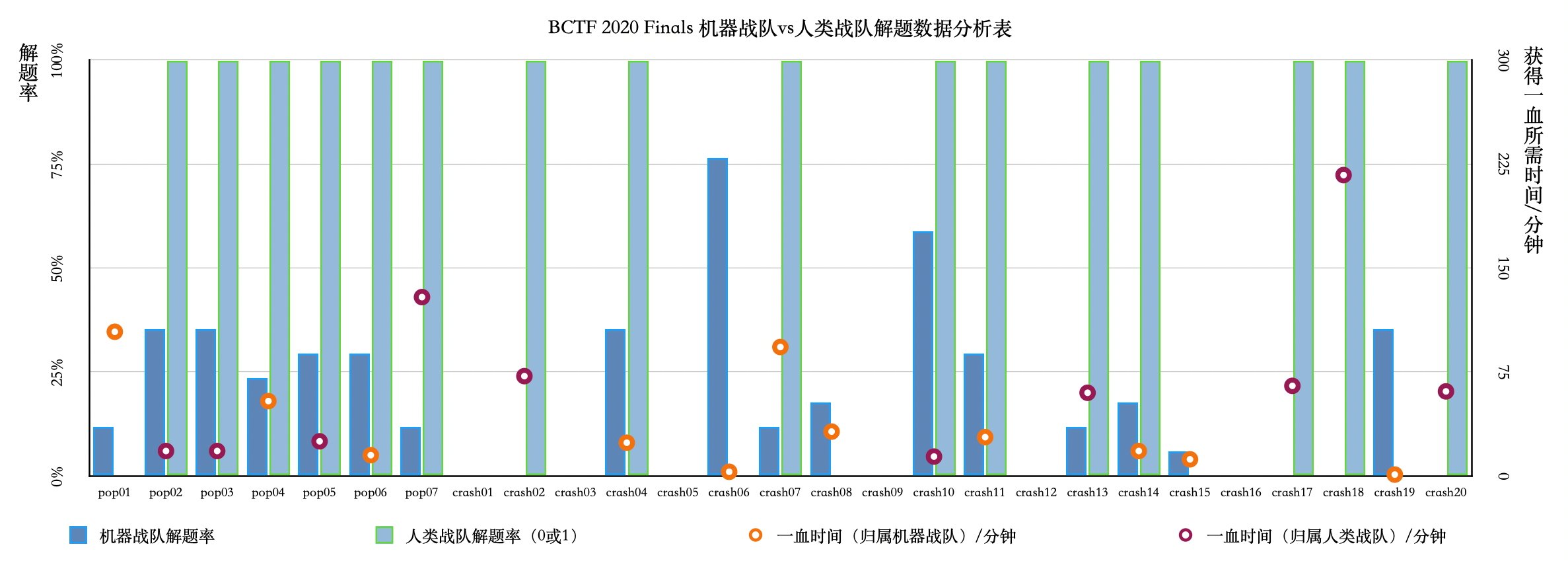 Popcalc赛题中,机器对于栈溢出、格式化字符串等经典漏洞的自动化漏洞利用已经比较擅长,平均机器解出率(已解出战队/提交签到题得分的战队)大于20%,机器拿到一血的速度最快为15分钟,但人类战队拿到一血的平均时间快于机器战队。