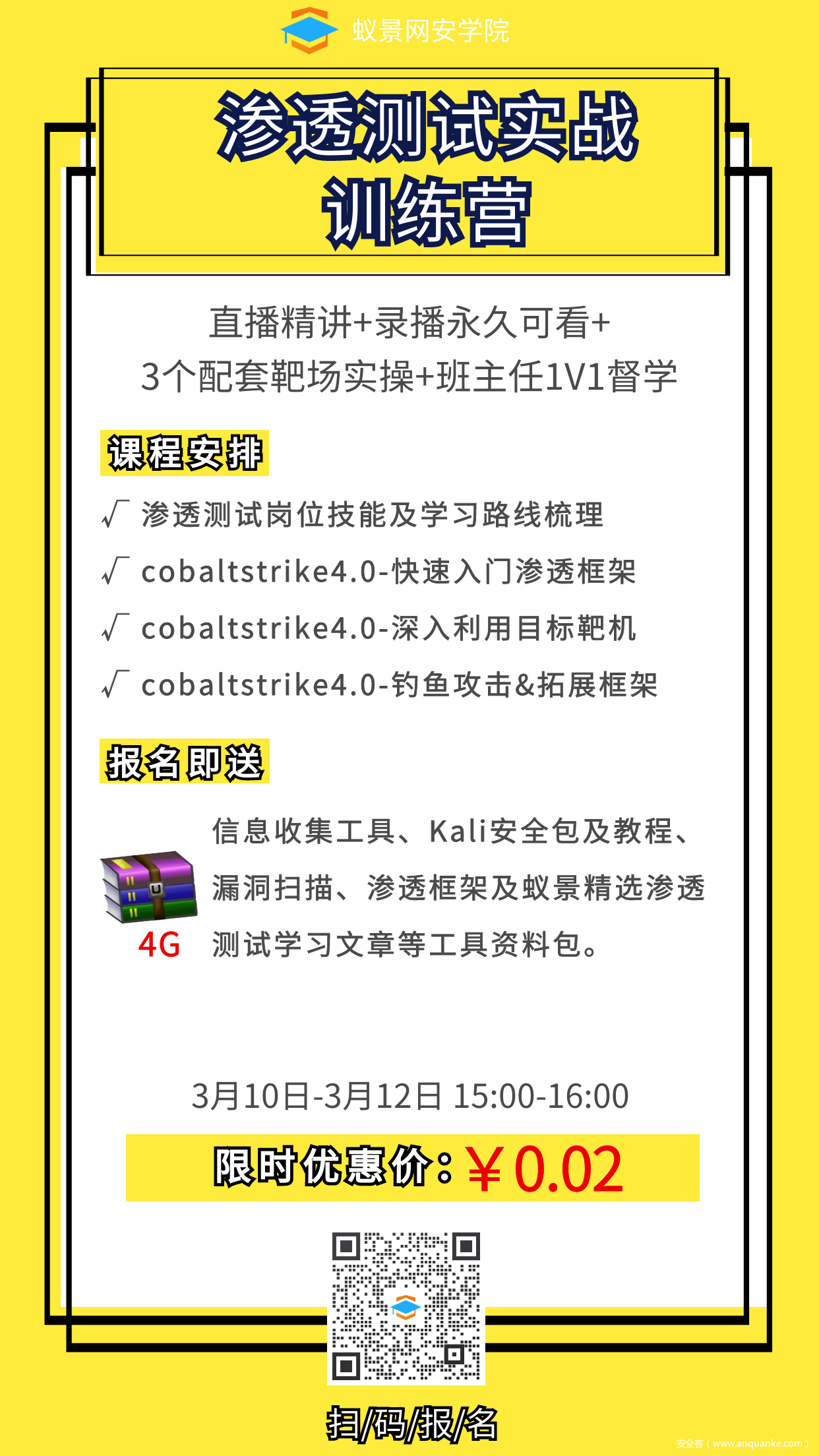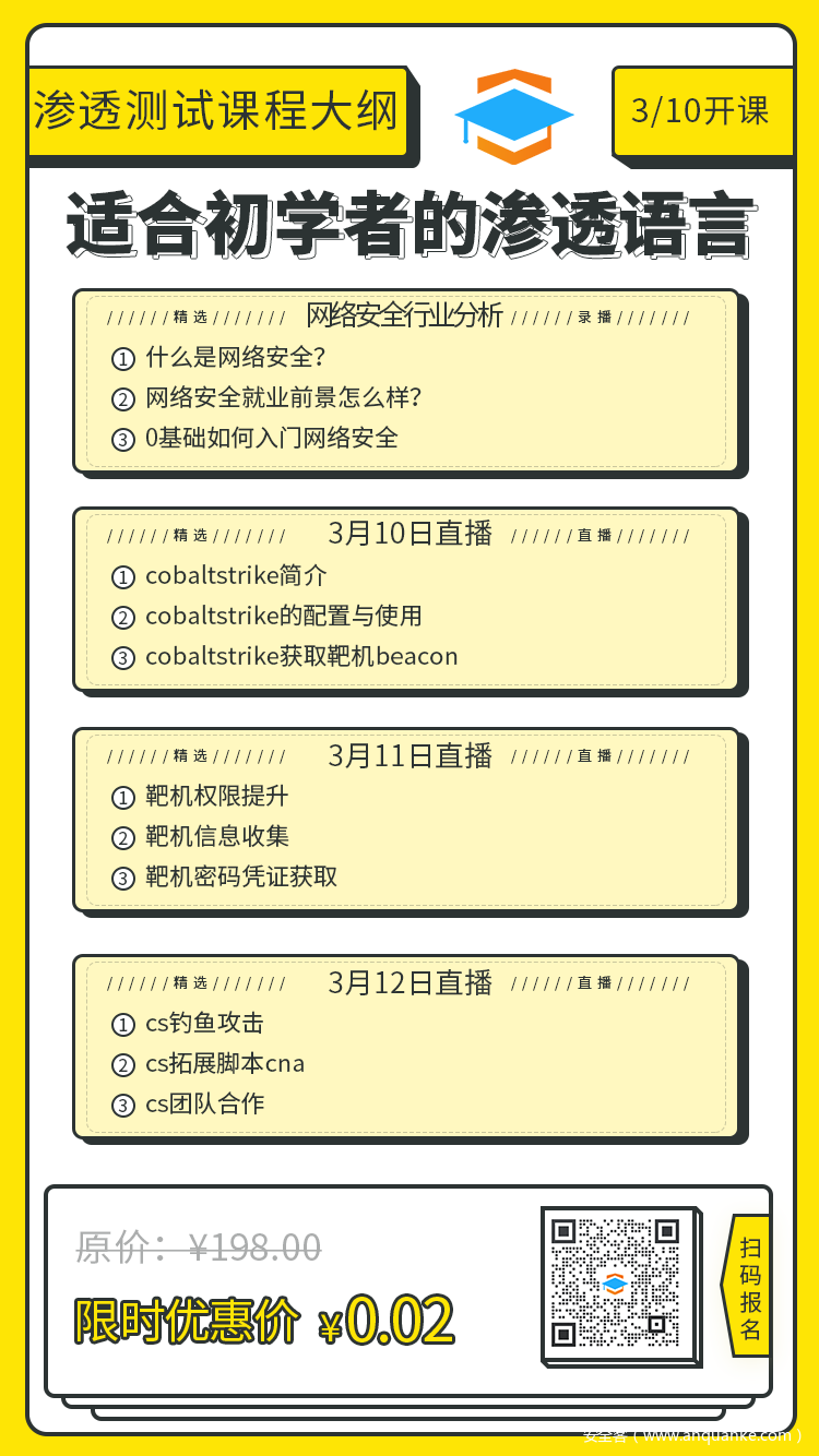 2分钱,你不仅能了解渗透测试岗位的知识体系,掌握渗透测试的2-3个核心技能:快速入门渗透框架,深入利用目标靶机,钓鱼攻击&拓展框架。并能在最短时间内学完就实战。