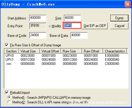 继续实验现在打开桌面上的ImportREC程序,首先在进程列表中选择C:\Reverse\6\crackme6.exe,然后在OEP中填入94F8(也就是在OD中找到的一个信息),然后点击“IAT AutoSearch”按钮,接着点击“GetImports”按钮,就可以看到程序的输入表信息了。