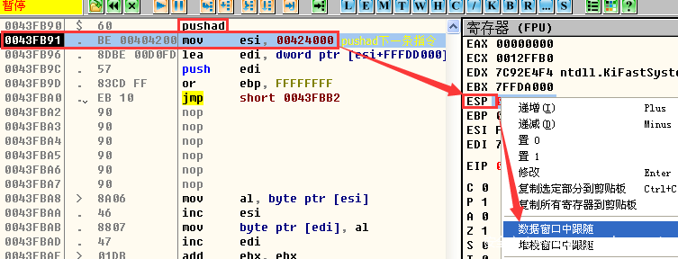 这时候呢我们还是用OD来脱壳,使用OD载入CrackMe6.exe程序,OD的反汇编窗口停留在一条pushad指令上面,我们按下F8单步跟踪到下一条指令,然后在右侧的寄存器窗口中选中ESP寄存器(可以看到ESP寄存器的值为0012FFA4),并单击鼠标右键,在弹出的右键菜单中选择“数据窗口中跟随”,如图所示: