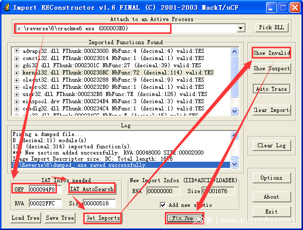 点击右侧的“Show Invalid”按钮,看看是否存在无效的输入表项目。无效的输入表项目前面带有问号(?),如果有可以使用右键菜单删除。这里没有无效的输入表项目,所以选择“Fix Dump”按钮,对我们的dumped.exe进行修复,得到dumped_.exe程序。