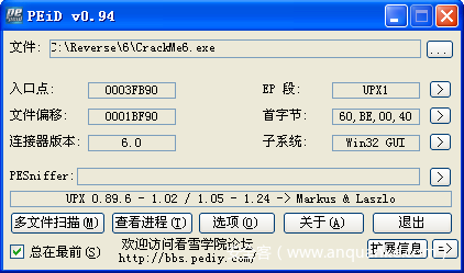主机C:\Reverse\6目录下有一个CrackMe6.exe程序,这个程序是使用upx程序加过壳的,请尝试对其进行手工脱壳,并编写详细的分析报告。要求脱壳后的程序可以正常运行。