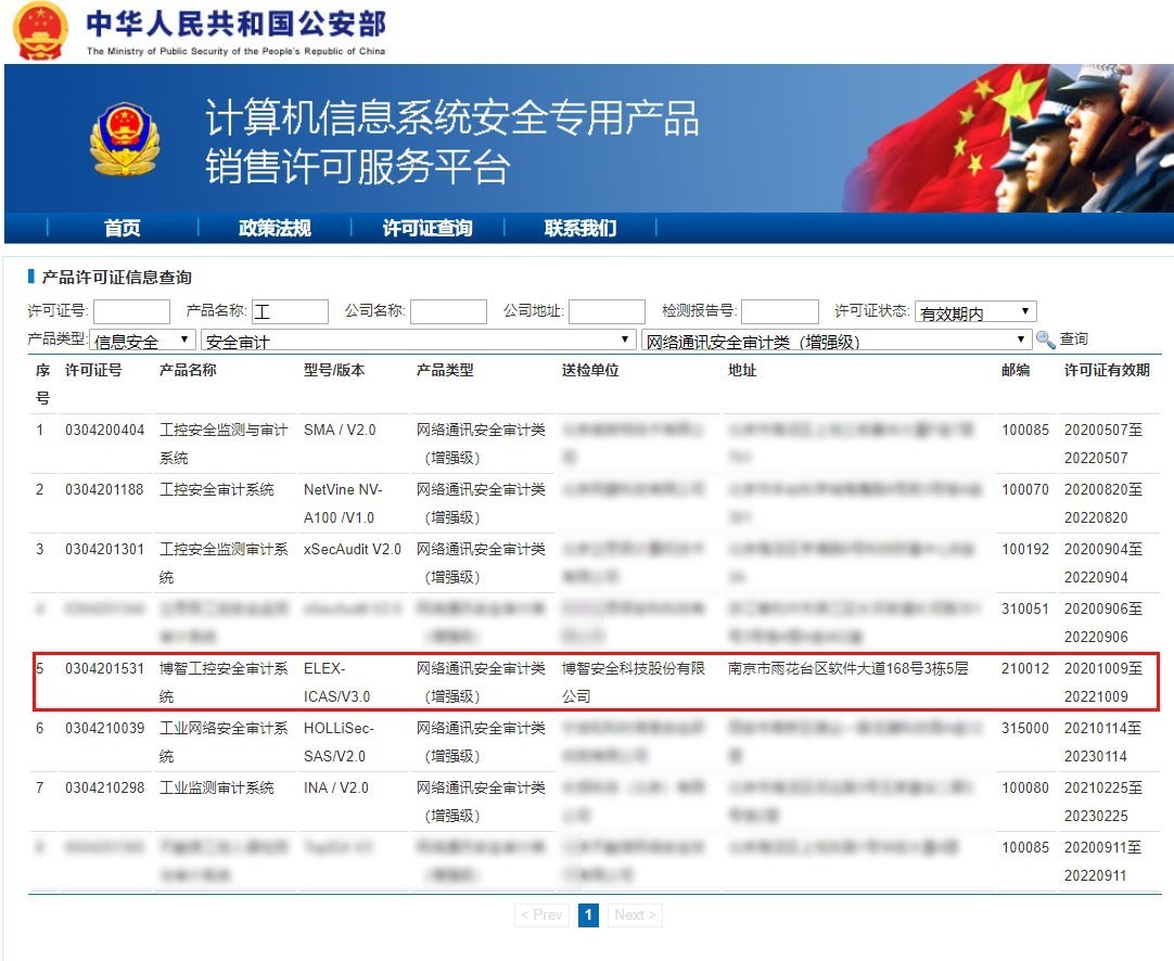 近期,博智安全科技股份有限公司(以下简称“博智安全”)自主研发的“博智工控安全审计系统 ELEX-ICAS/V3.0”凭借卓越的性能和显著的技术优势,荣获公安部颁发的网络通讯安全审计类增强级销售资质,成为全国7家拥有工控安全领域审计类增强级销售资质的安全厂商之一。