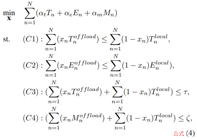 根据以上公式,我们可以推导出在系统约束条件下联合优化时延、能耗成本和内存使用量的优化问题,如下图所示: