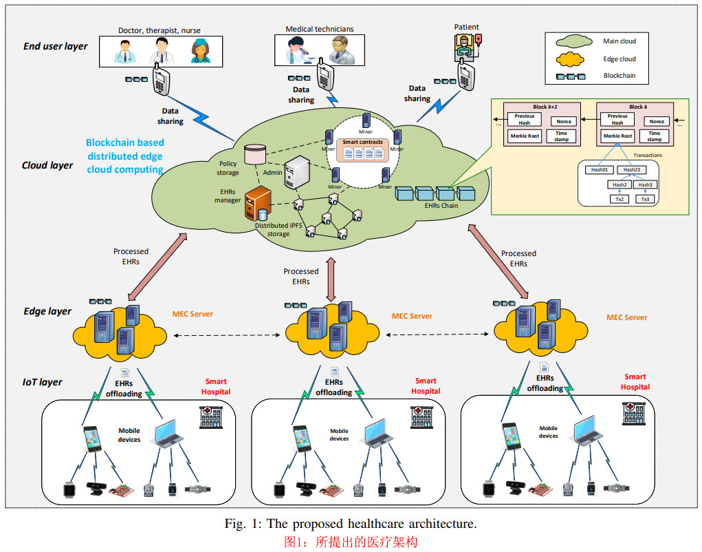 我们在图1中所考虑的医疗系统架构,由以下四层组成。(1)物联网层由许多智能医院组成,这些医院由MD作为移动网关从传感器物联网设备上监测不同地点的患者。(2)边缘层包括一群边缘云节点,每个边缘节点管理一组附近的物联网设备,为医疗卫生提供分布式计算服务。所有的计算(包括数据处理和分析)都在边缘层实现,以提供即时的医疗服务。(3)云层,存储来自边缘节点处理后的健康数据,并与终端用户进行数据共享。为了构建云区块链网络,我们创建了四个关键的云组件,包括管理员、EHRs管理器、分布式云存储、与矿工的智能合约和策略存储。其详细情况将在下一节中介绍。(4)终端用户层是指有意使用云医疗服务的医疗机构、护理人员和患者等医疗用户网络。例如,医生利用云端分析的健康数据进行疾病诊断,或者患者可以追踪自己的医疗记录史。需要注意的是,这里的区块链网络由边缘服务器、云实体和终端用户组成,并由分布在区块链参与者[14]上的安全事务账本维护。接下来,我们重点分析数据卸载和数据共享方案。