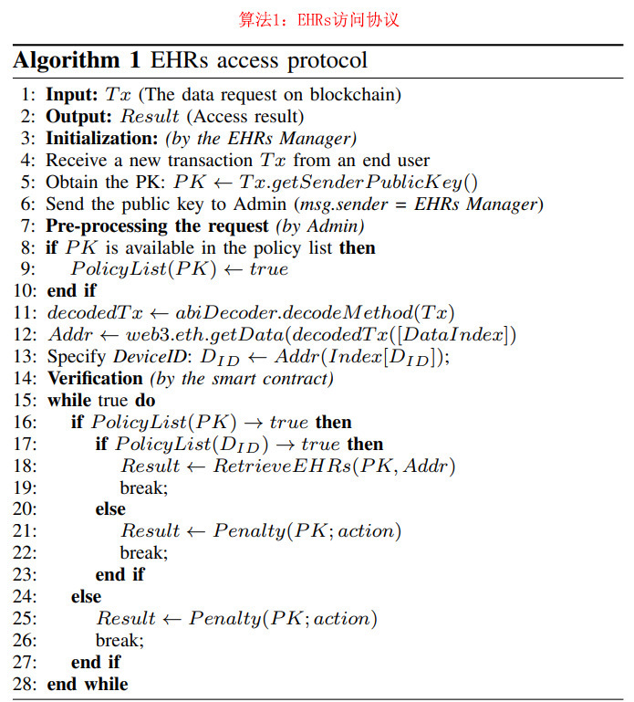- 处罚(PK,action):(由管理员执行)当检测到有未经授权的请求进入EHRs系统时,EHRs管理器将通知智能合约对请求者进行处罚。在本论文中,我们给未经授权的移动实体一个警告信息作为惩罚。