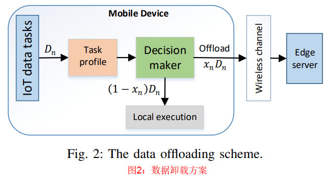 1)卸载模式:在我们近期工作[16]的实验结果的激励下,本文提出了如图2所示的卸载架构,它包括两个主要模块:移动设备上的任务配置文件和决策装置。