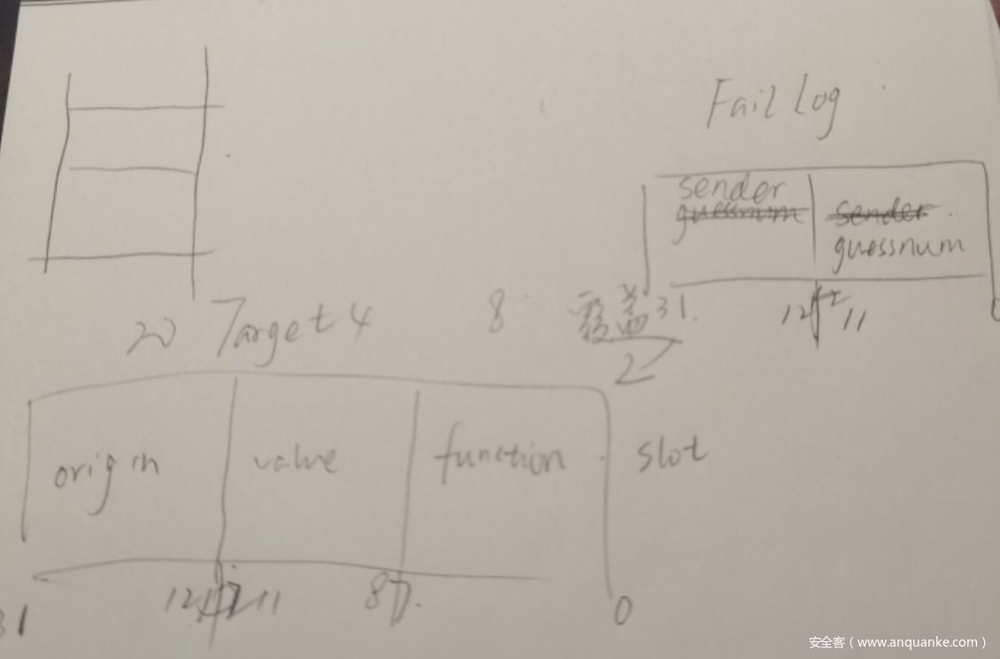 Solidity在0.5以下都有因为结构体未初始化覆盖存储的漏洞。那么这里首先我们就可以看到两个结构体都会造成不同程度的覆盖,首先我们可以画出如下的storage地址结构。