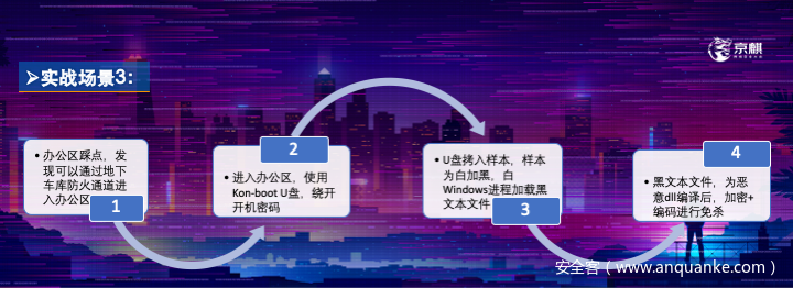 第三个场景是我们红蓝对抗中真实遇到的一个场景。攻击者前期在公司周围踩点,发现由于防火通道不能关闭,普通人可以通过公用地下车库走楼梯间进入办公区。而周末加班时楼梯间到办公区的门禁有时会被长时间打开。