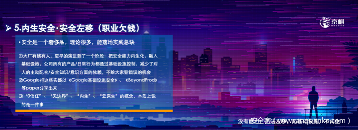 与此同时,Google把这些实践以《Google基础设施安全》、《BeyondProd》等Paper分享出来,业界开始热议“零信任”、“无边界”、“内生”、“云原生”的概念,都跟这个趋势有关系,本质上说的是一件事。