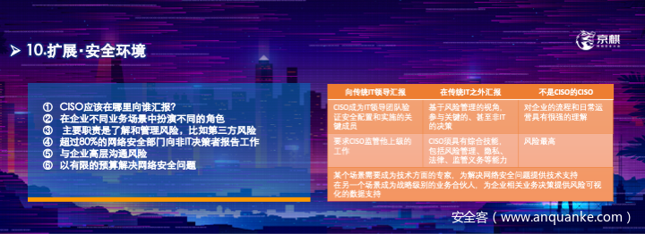 CISO在企业不同业务场景中扮演不同角色。某个场景需要成为技术方面的专家,为解决网络安全问题提供技术支持。在另一个场景成为战略级别的业务合伙人,为企业相关业务决策提供风险可视化的数据支持。