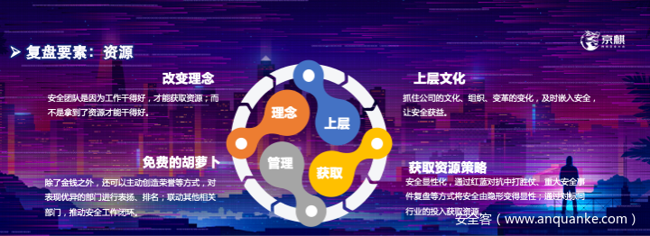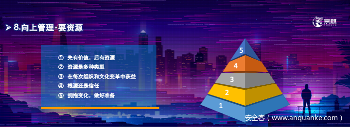 3、获取资源策略:作为安全团队的负责人一定要主动去想办法争取更多的资源,常见的有将安全工作显性化,通过红蓝对抗中打胜仗、重大安全事件复盘、对标同等或更好的企业投入,以获取更多的资源。