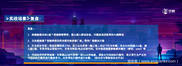点:在终端上的攻防对抗领域,单个技术点包括:常见权限维持工具CobaltStrike检测、无文件攻击、终端插U盘等物理攻击方式,提出单点技术防护和检测方案。