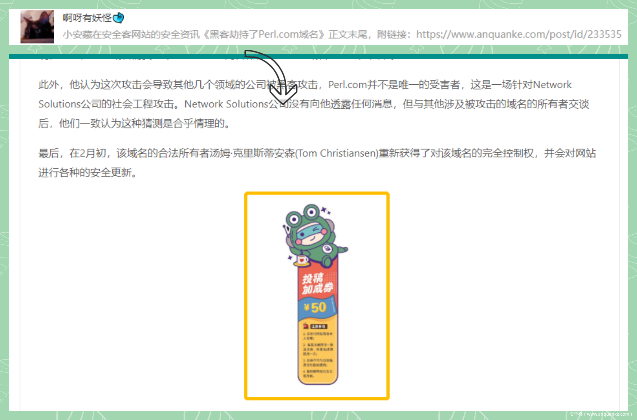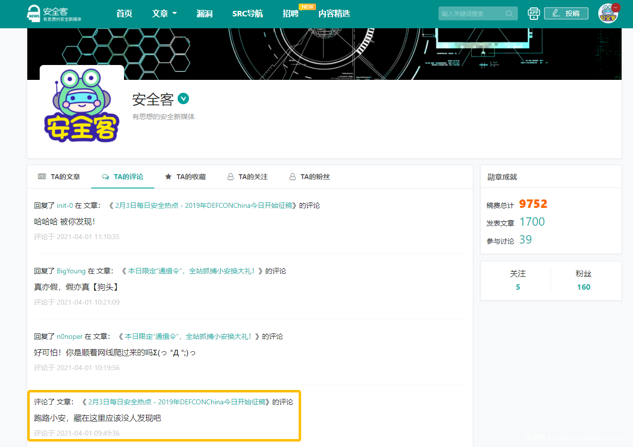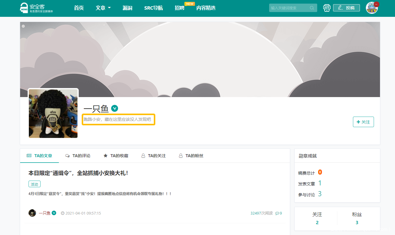 小安删稿跑路,不愿透露姓名的某兔报警之余,发布4月1日限定“悬赏令”,重奖悬赏找小安!4月1日10:00-18:00,不论大佬、小白,还是吃瓜群众,皆可在“安全客”官网,寻找跑路小安藏匿点,提报藏匿地点信息将有机会领取专属礼物!