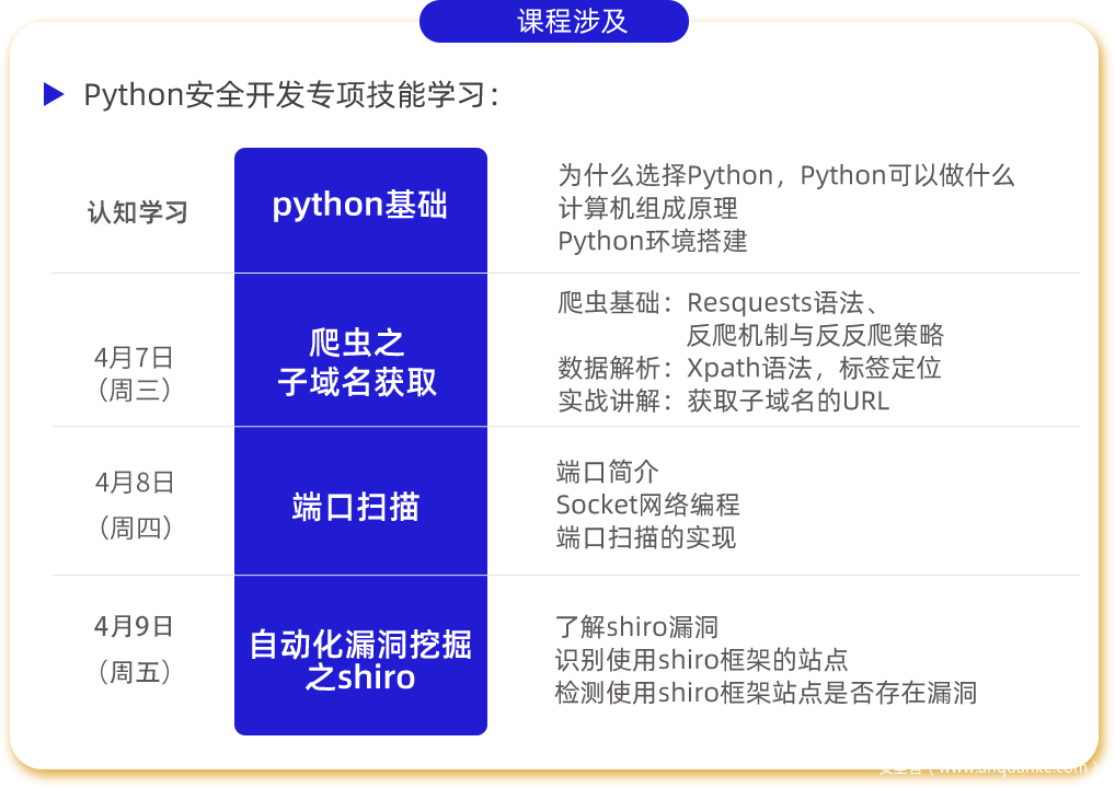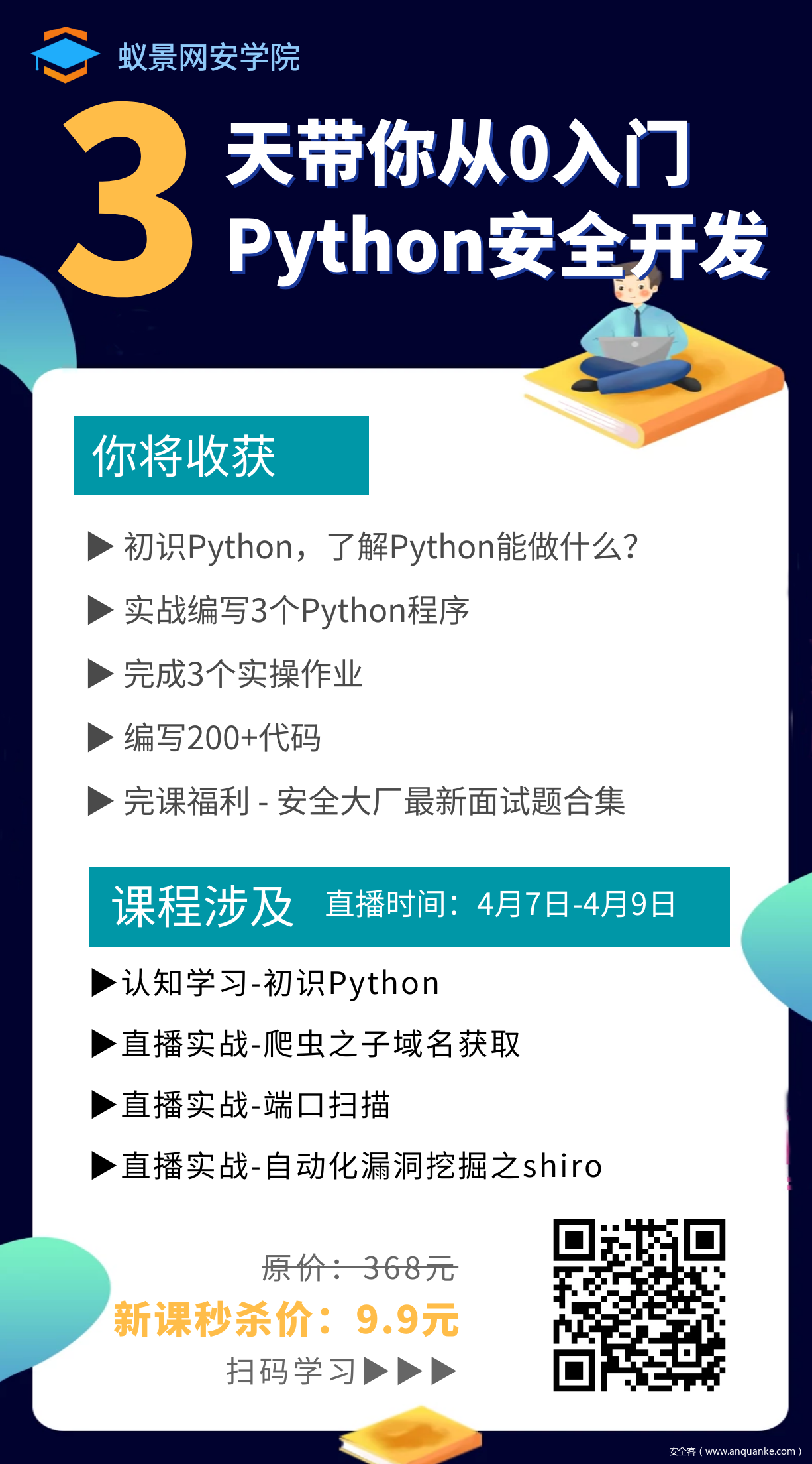 因此,我给大家挑了一门我详细了解过的课程,蚁景网安学院出品的《3天 · 带你从0入门Python安全开发》。