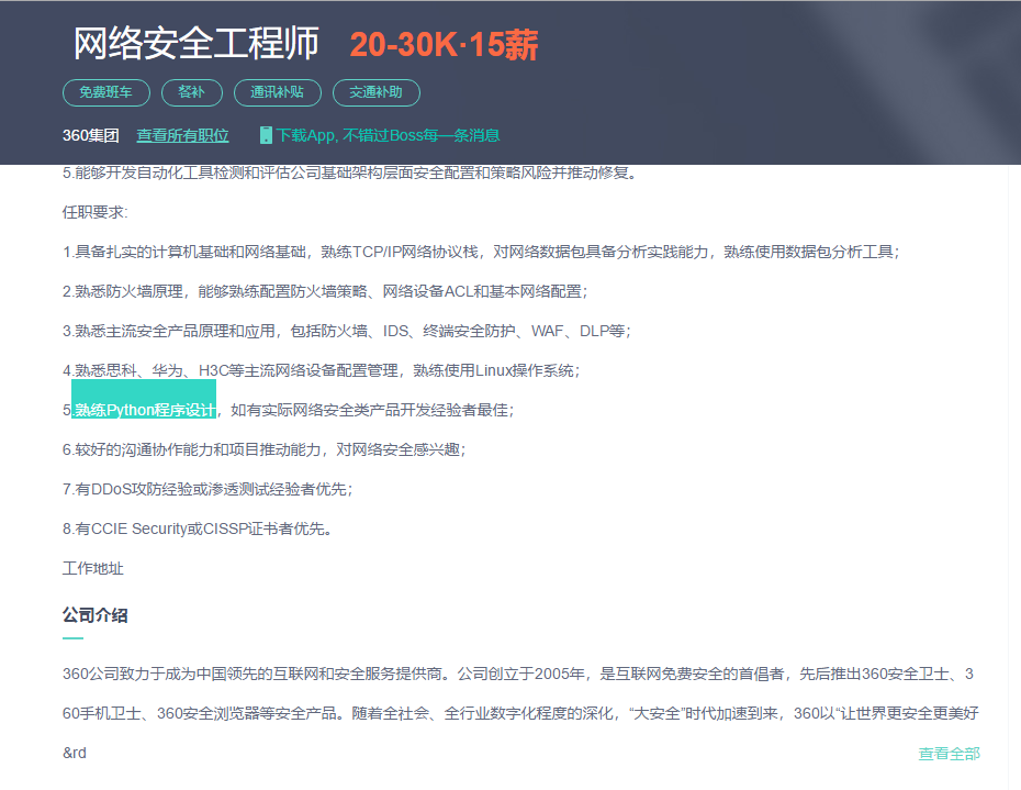 未来,简单、高效、可移植的Python语言将成为行业核心语言,所以,如果你正在或即将从事Web安全、渗透测试等与网安相关工作岗位,Python安全开发将是你的必备且最适合入门的技能,据不完全统计,懂Python安全开发的安全人,薪资至少高出同龄人30%以上!