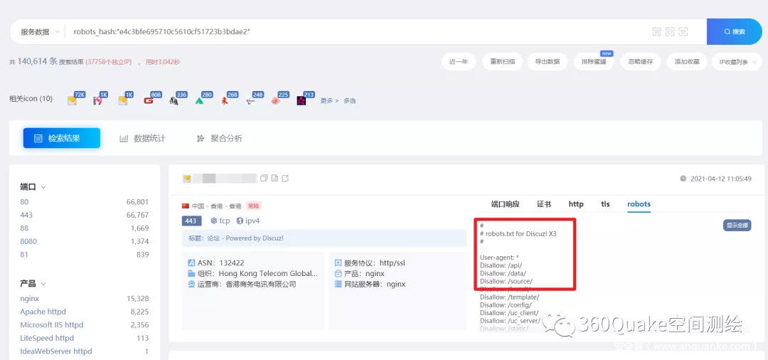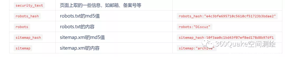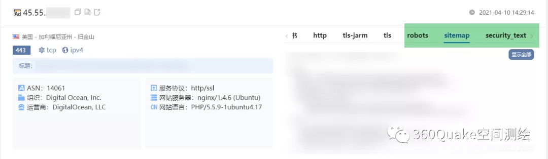 好东西要摆出来。丰富全面的结果呈现是Quake产品设计之初的理念之一(慎重,也可能逼疯UI),我们发现很多协议深度识别能力往往过于关注“深度”,导致被大家错过,与Quake“看见”的理念是相违背的,对大家而言也非常可惜,所以我们在相关的检索结果当中新增了3个主要TAB,分别是:robots、sitemap、security_text,欢迎大家尝试检索并提出宝贵意见,也可参见我们的【帮助】找到更多检索姿势和入口。(高级会员可见;终身会员可见且可搜索)这三个Tab对应的搜索语法分别是: