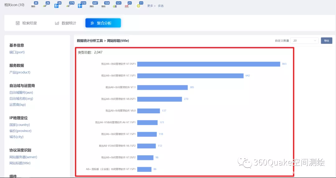 小饼如嚼月,中有酥和饴。检索结果左侧的聚合功能是Quake发布上线的伴生功能之一,但一直以来更多承担着结果概览和数量展示,甚至是“快速语法”入口的角色,我们希望通过聚合分析功能,将视角聚焦到聚合的种类而不仅仅是数量,解答到底有多少种端口在开放,而不仅仅是开放一个端口的服务观测数量是多少,使得聚合功能既能够用于快速概览(皮)找到关注点,也能够进一步专注分析(馅)。