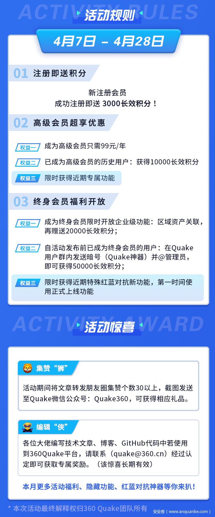 平静祥和而又充实的一周又到来了,不知道各位一线打工人们的shell是否已经安排妥当?希望今年的大活动能够更加规范,切实的促进产业生态体系更加完善,带动国家整体安全能力的长足发展。为此Quake已经悄无声息的进行了一波“存粮”功能更新,配合我们的活动进行限全面开放,希望能够助力攻防双方: