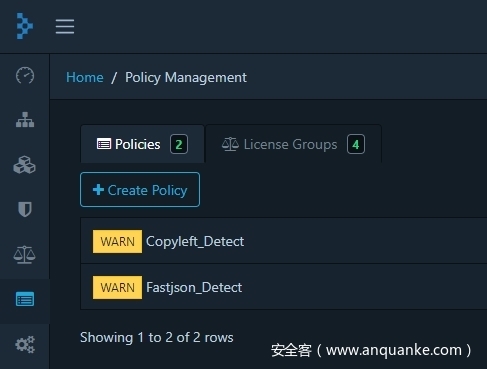 在 “Policy Management” 模块中,可以创建自定义的分析策略,比如当匹配/未匹配一个或多个组件、许可证、许可证组时触发警告等等,简单而又灵活。
