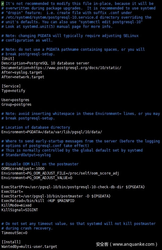 # 并在 "ExecStart=/usr/pgsql-10/bin/postmaster -D ${PGDATA}" 行的上面添加一行,内容为 "ExecStart="