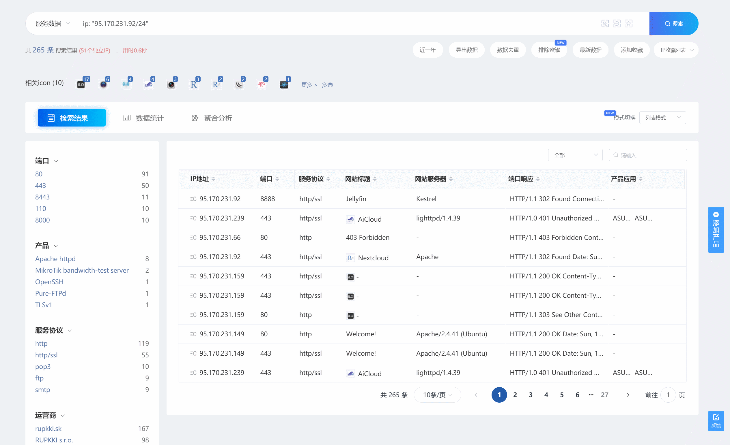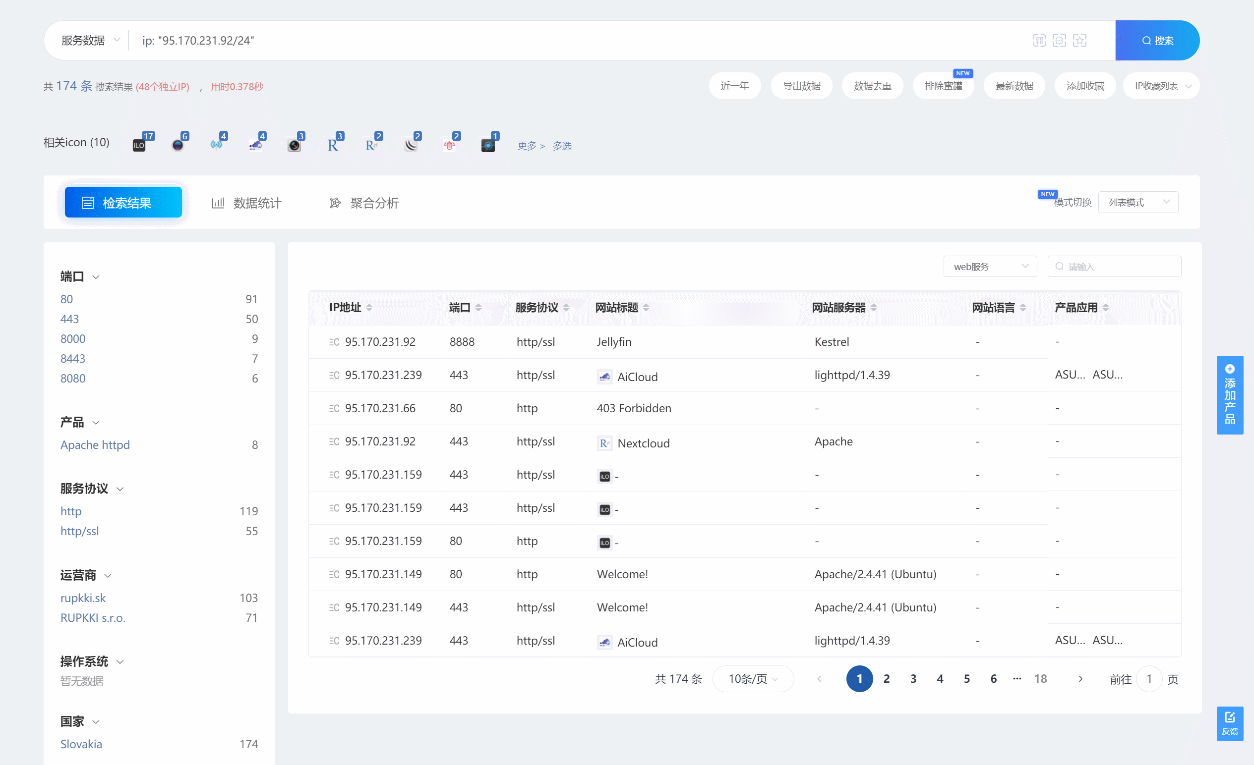 新版本增加了一个非常实用的小功能,我们在检索结果页的每一个IP旁边增加了一个新的工具,能够一键检索该IP所在的C段。别告诉我你还不知道可以搜IP段(支持cidr查询),无论是攻方或是守方,找到入口或观察可能存在的入口都是非要有必要的。