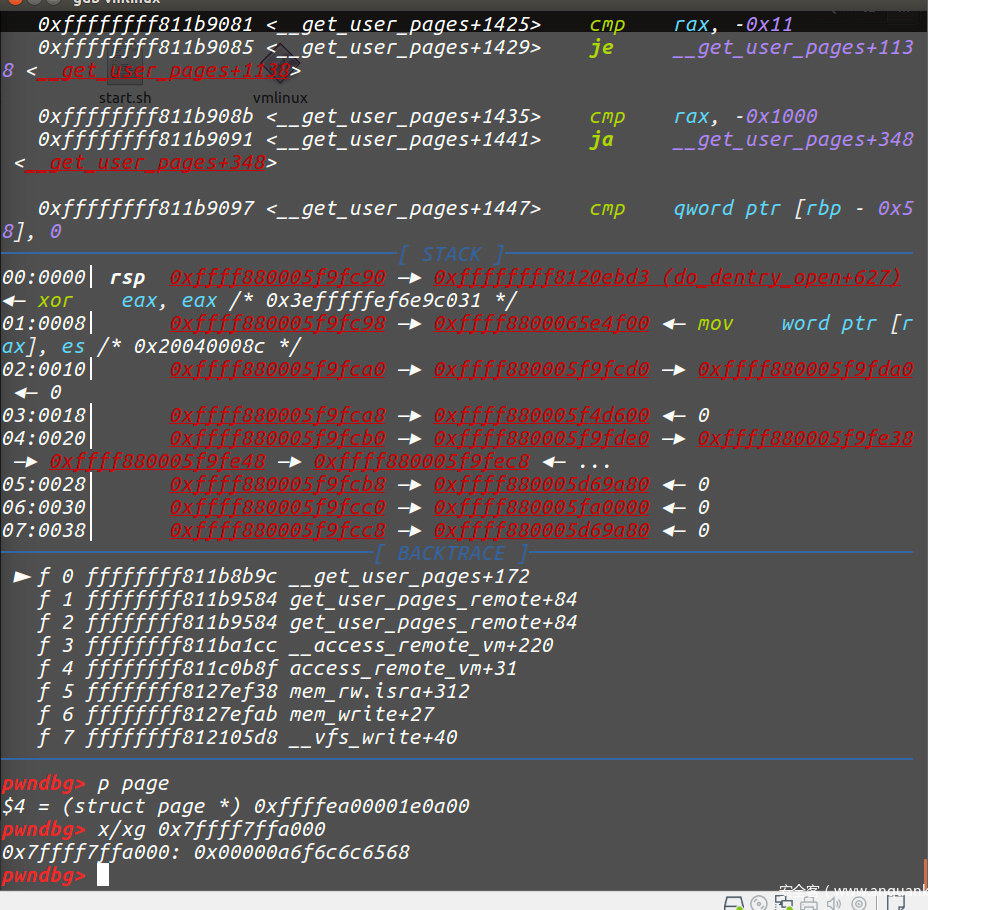 我们在follow_pages_mask函数前也就是mm/gup.c:573处下一个断点后,remote上qemu,然后运行我们的阉割版exp。