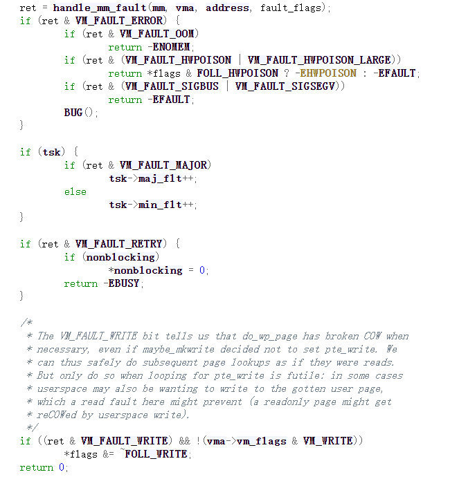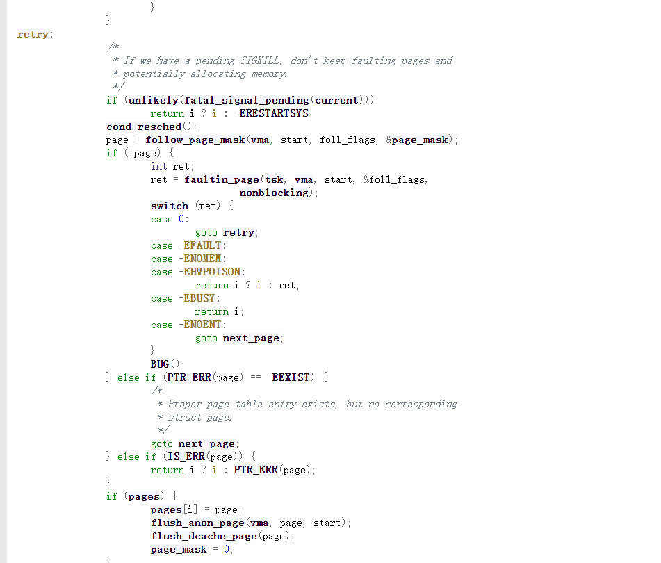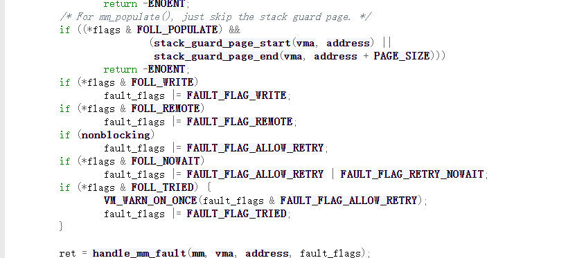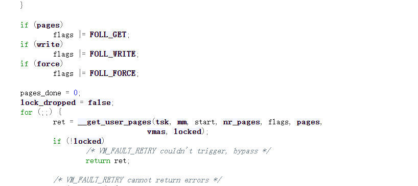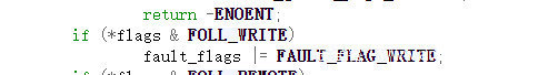 可以如果是write的设置对应的flags位,接下来调用__get_user_pages函数,我们跟入这个函数中。由于代码量过大,我们只需要关注重点需要关注的地方,也就是下面一部分中