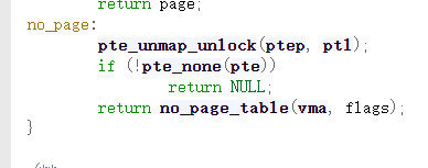 可以看到我们返回空是因为我们还没有给虚拟内存分配物理内存,所以跳到no_page,在no_page处就会调用no_page_table函数返回空。所以这里我们知道了第一次调用follow_pages_mask函数返回0的原因是因为我们的映射还是在虚拟内存中,并没有分配实际的物理内存,所以这里我们找不到page。