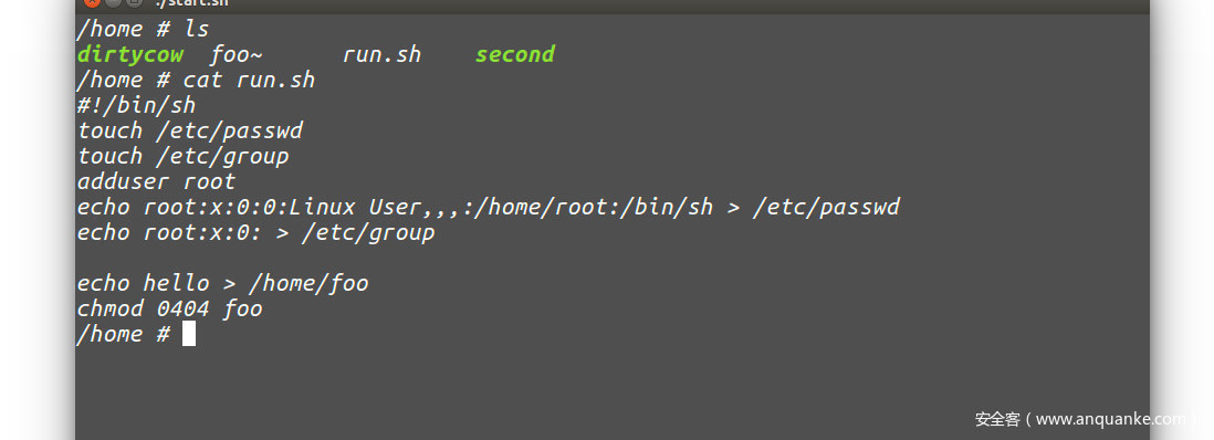 在环境中有一个run.sh脚本来创建一个root用户,并且创建一个只读的文件foo,并且往其中写入hello的内容
