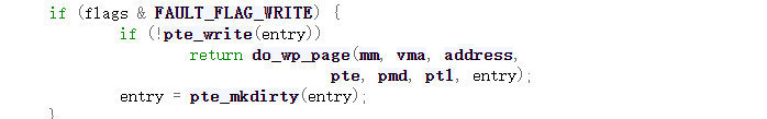进入缺页处理函数,这里就会做一个标记,表示因为没有写权限而错误。做完了标记之后就会进入到handle_mm_fault处理函数中。此时的调用链依旧像刚刚一样handle_mm_fault-> __handle_mm_fault -> handle_pte_fault