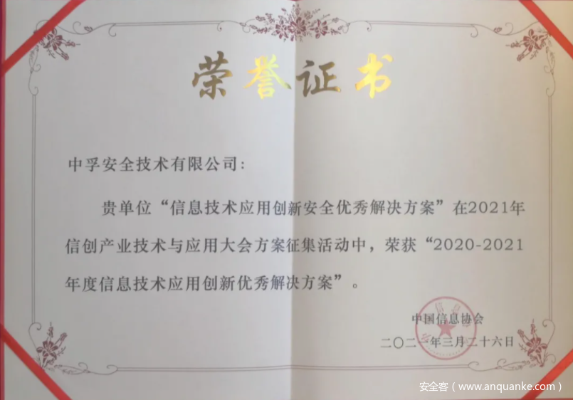 2021年是“十四五”开局之年、全面建设社会主义现代化国家新征程开启之年。在当前时代背景下,新基建是风口,信创是新基建风口之上的风口。崛起的“信创产业”是国家信息安全的屏障、是重塑中国IT产业基础的中流砥柱、是经济转型和发展的核心力量、是智能化时代社会发展的底层基础、是数字经济的重要推手。中孚信息深耕信创行业十余年,本次获奖的信创安全解决方案遵循国家相关标准要求,针对信创终端数据安全风险,为用户构筑终端安全防护与管理体系。