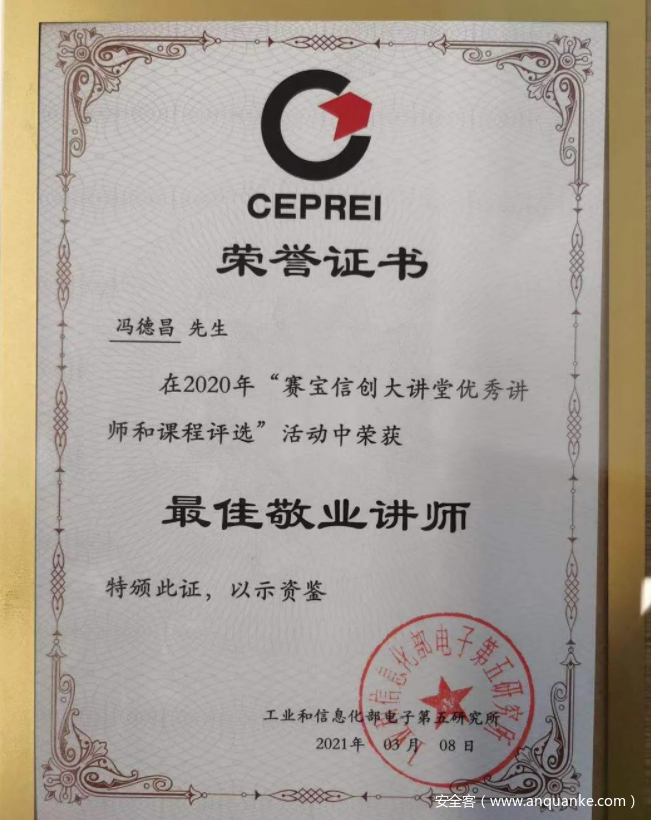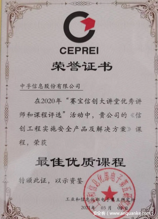 近日,在工业和信息化部电子第五研究所主办的2020年“赛宝信创大讲堂优秀讲师和课程评选”活动中,中孚信息推出的《信创工程实施安全产品及解决方案》课程荣获“最佳优质课程”奖,中孚信息解决方案中心副总经理冯德昌获得“最佳敬业讲师”称号。