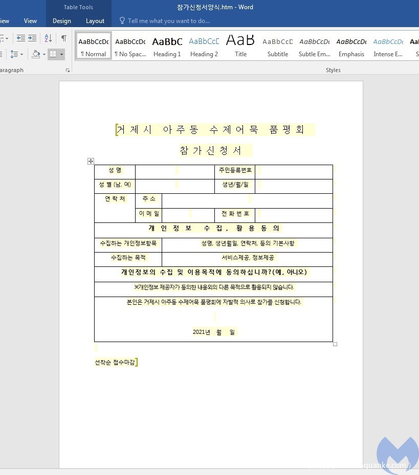 该文档的名称为韩文“참가신청서양식.doc”,内容为韩国某个城市的博览会的参展申请表。文件的创建时间是2021年3月31日,这与攻击发生在同一时间。