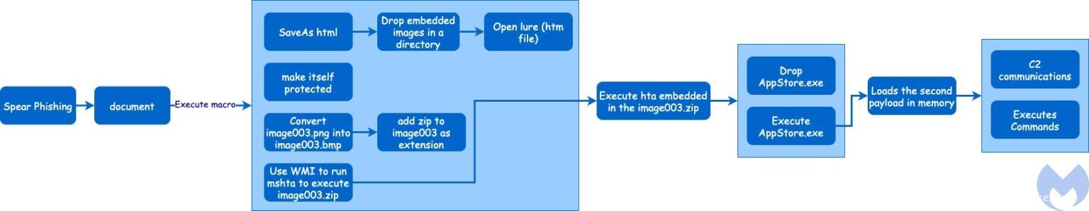 这次攻击很可能是从分发钓鱼邮件开始的,该邮件携带了武器化的恶意文件。下图显示了这次攻击的完整过程。在接下来的章节中,我们将对这个过程进行详细的分析。